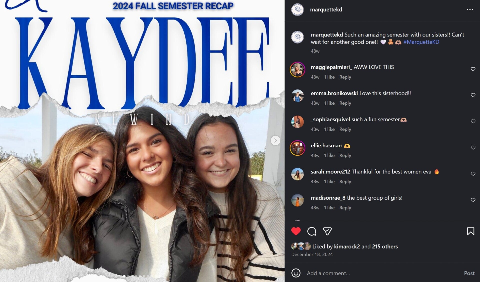 Beyond technical and managerial skills, my director role emphasized the importance of authenticity and values-driven leadership. I learned how to communicate the genuine nature of Kappa Delta sorority as a sisterhood, highlighting kindness, confidence, and support, through our social media presence. This mentorship strengthened my creative, organizational, and interpersonal skills, helping me grow not only as a leader but also as a representative of the values and mission of the organization.